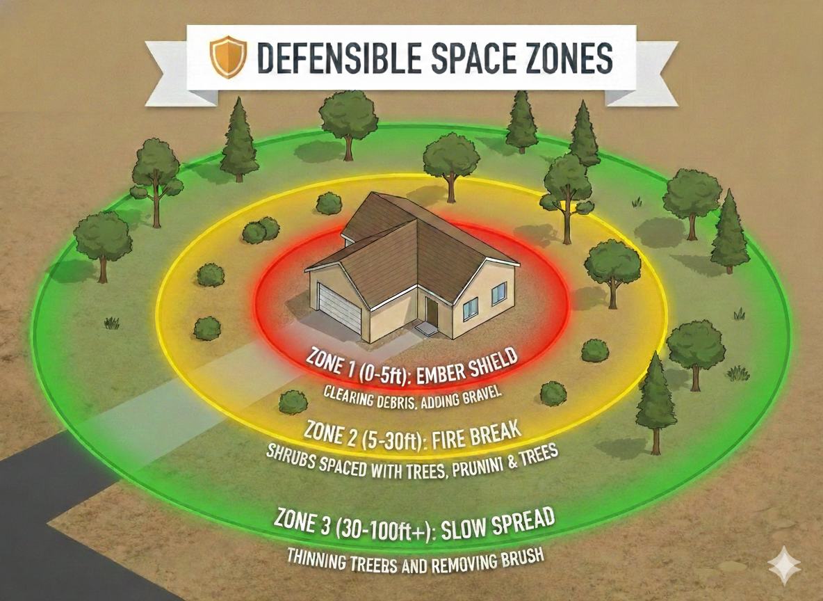 Defensible Space Creation: Strategic clearing of Zone 1 and Zone 2 to create a critical safety buffer around your home and structures.